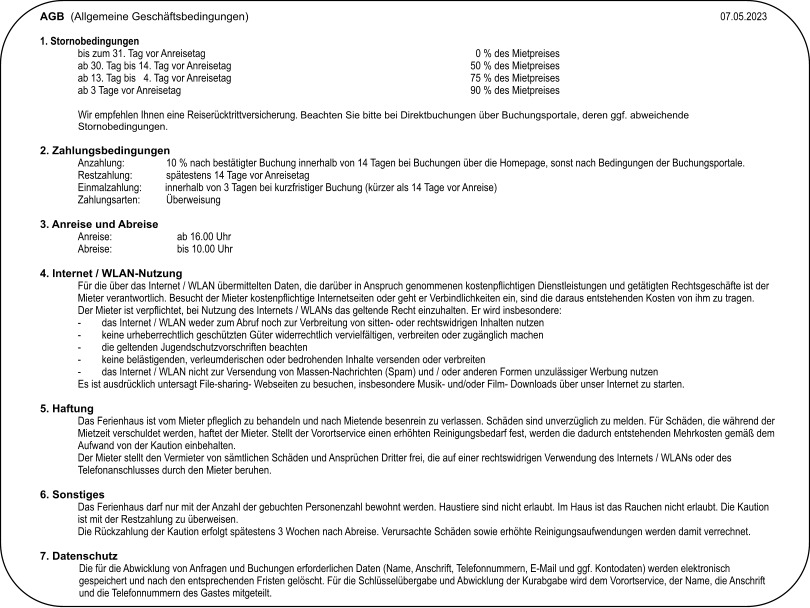 AGB  (Allgemeine Geschäftsbedingungen)                                                                                                                					07.05.2023  1. Stornobedingungen bis zum 31. Tag vor Anreisetag                                                                     	0 % des Mietpreises ab 30. Tag bis 14. Tag vor Anreisetag                                                     	  50 % des Mietpreises ab 13. Tag bis   4. Tag vor Anreisetag                                                       	75 % des Mietpreises ab 3 Tage vor Anreisetag                                                                                             	90 % des Mietpreises  Wir empfehlen Ihnen eine Reiserücktrittversicherung. Beachten Sie bitte bei Direktbuchungen über Buchungsportale, deren ggf. abweichende Stornobedingungen.   2. Zahlungsbedingungen Anzahlung:                10 % nach bestätigter Buchung innerhalb von 14 Tagen bei Buchungen über die Homepage, sonst nach Bedingungen der Buchungsportale. Restzahlung:             spätestens 14 Tage vor Anreisetag Einmalzahlung:         innerhalb von 3 Tagen bei kurzfristiger Buchung (kürzer als 14 Tage vor Anreise) Zahlungsarten:          Überweisung  3. Anreise und Abreise Anreise:                         ab 16.00 Uhr Abreise:                         bis 10.00 Uhr  4. Internet / WLAN-Nutzung Für die über das Internet / WLAN übermittelten Daten, die darüber in Anspruch genommenen kostenpflichtigen Dienstleistungen und getätigten Rechtsgeschäfte ist der Mieter verantwortlich. Besucht der Mieter kostenpflichtige Internetseiten oder geht er Verbindlichkeiten ein, sind die daraus entstehenden Kosten von ihm zu tragen.Der Mieter ist verpflichtet, bei Nutzung des Internets / WLANs das geltende Recht einzuhalten. Er wird insbesondere: -	das Internet / WLAN weder zum Abruf noch zur Verbreitung von sitten- oder rechtswidrigen Inhalten nutzen -	keine urheberrechtlich geschützten Güter widerrechtlich vervielfältigen, verbreiten oder zugänglich machen -	die geltenden Jugendschutzvorschriften beachten -	keine belästigenden, verleumderischen oder bedrohenden Inhalte versenden oder verbreiten -	das Internet / WLAN nicht zur Versendung von Massen-Nachrichten (Spam) und / oder anderen Formen unzulässiger Werbung nutzen Es ist ausdrücklich untersagt File-sharing- Webseiten zu besuchen, insbesondere Musik- und/oder Film- Downloads über unser Internet zu starten.  5. Haftung Das Ferienhaus ist vom Mieter pfleglich zu behandeln und nach Mietende besenrein zu verlassen. Schäden sind unverzüglich zu melden. Für Schäden, die während der Mietzeit verschuldet werden, haftet der Mieter. Stellt der Vorortservice einen erhöhten Reinigungsbedarf fest, werden die dadurch entstehenden Mehrkosten gemäß dem Aufwand von der Kaution einbehalten. Der Mieter stellt den Vermieter von sämtlichen Schäden und Ansprüchen Dritter frei, die auf einer rechtswidrigen Verwendung des Internets / WLANs oder des Telefonanschlusses durch den Mieter beruhen.  6. Sonstiges Das Ferienhaus darf nur mit der Anzahl der gebuchten Personenzahl bewohnt werden. Haustiere sind nicht erlaubt. Im Haus ist das Rauchen nicht erlaubt. Die Kaution ist mit der Restzahlung zu überweisen. Die Rückzahlung der Kaution erfolgt spätestens 3 Wochen nach Abreise. Verursachte Schäden sowie erhöhte Reinigungsaufwendungen werden damit verrechnet.  7. Datenschutz Die für die Abwicklung von Anfragen und Buchungen erforderlichen Daten (Name, Anschrift, Telefonnummern, E-Mail und ggf. Kontodaten) werden elektronisch gespeichert und nach den entsprechenden Fristen gelöscht. Für die Schlüsselübergabe und Abwicklung der Kurabgabe wird dem Vorortservice, der Name, die Anschrift und die Telefonnummern des Gastes mitgeteilt.